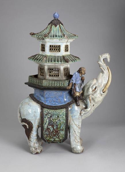Scultura in ceramica modellata, dipinta e invetriata raffigurante un elefante sulla groppa del quale è posato un padiglione a due piani con balconate con balaustre; sul davanti è una figura, probabilmente un saggio cinese.