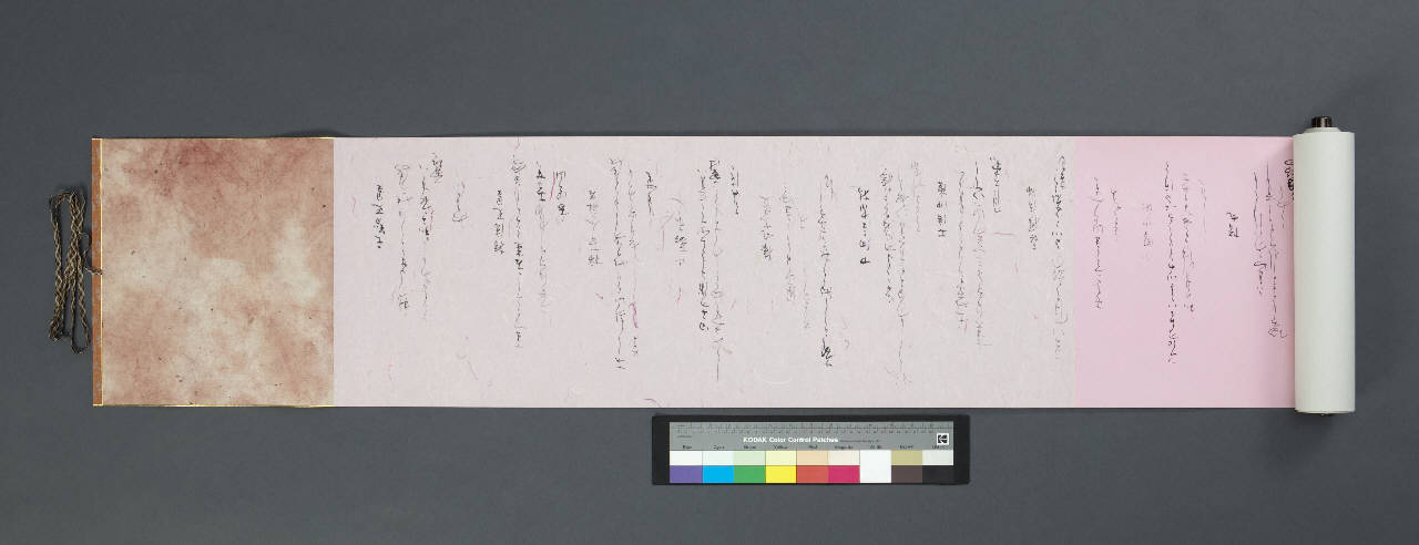 Rotolo orizzontale (makimono) in carta di diversi colori (a sezioni) con calligrafia a inchiostro nero. Montatura in seta. Bacchette in legno. Il rotolo è contenuto in una scatola in legno sulla quale vi sono iscrizioni a inchiostro, sia all'esterno sia all'interno. Il rotolo è avvolto in un panno giallo.