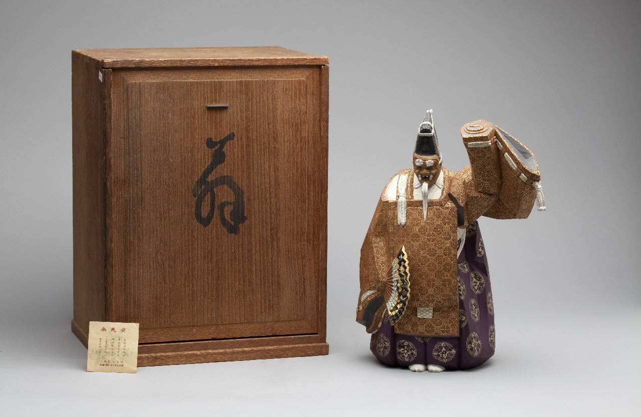 Piccola scultura in legno dipinto raffigurante Okina, con il braccio sinistro sollevato e nella mano destra un ventaglio pieghevole. Ha sua scatola in legno.