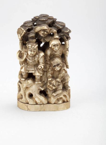 Piccola scultura decorativa (okimono) in avorio intagliato, inciso e inchiostrato, raffigurante una composizione con roccia e albero di pino, nei pressi dei quali sono un samurai con ventaglio aperto, due scimmie, tre demoni e un personaggio fantastico con volto di uccello; quest'ultimo tiene in mano un vessillo.