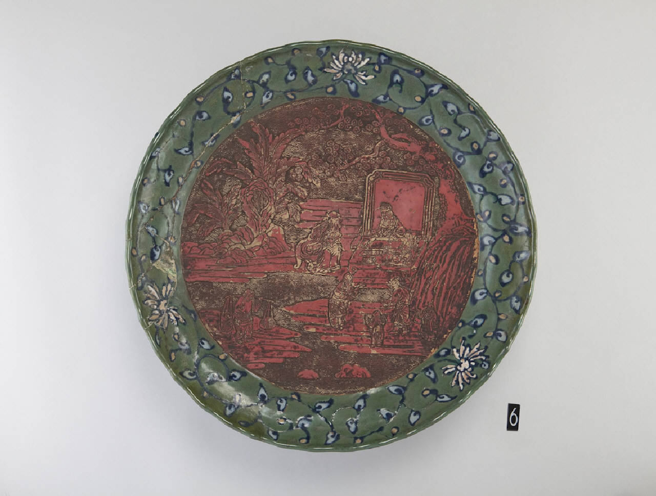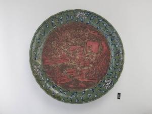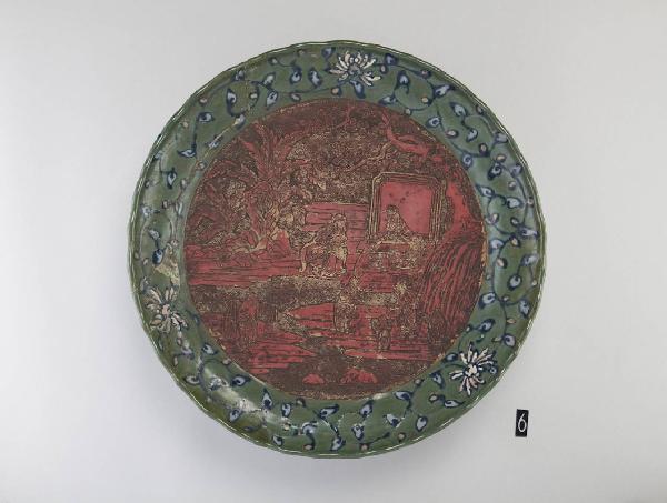 Piatto in ceramica smaltata e invetriata sostenuto da tre piedi a mensola. Sul fondo decorazione con paesaggio campestre con figure maschili; sul bordo girale fitomorfo.