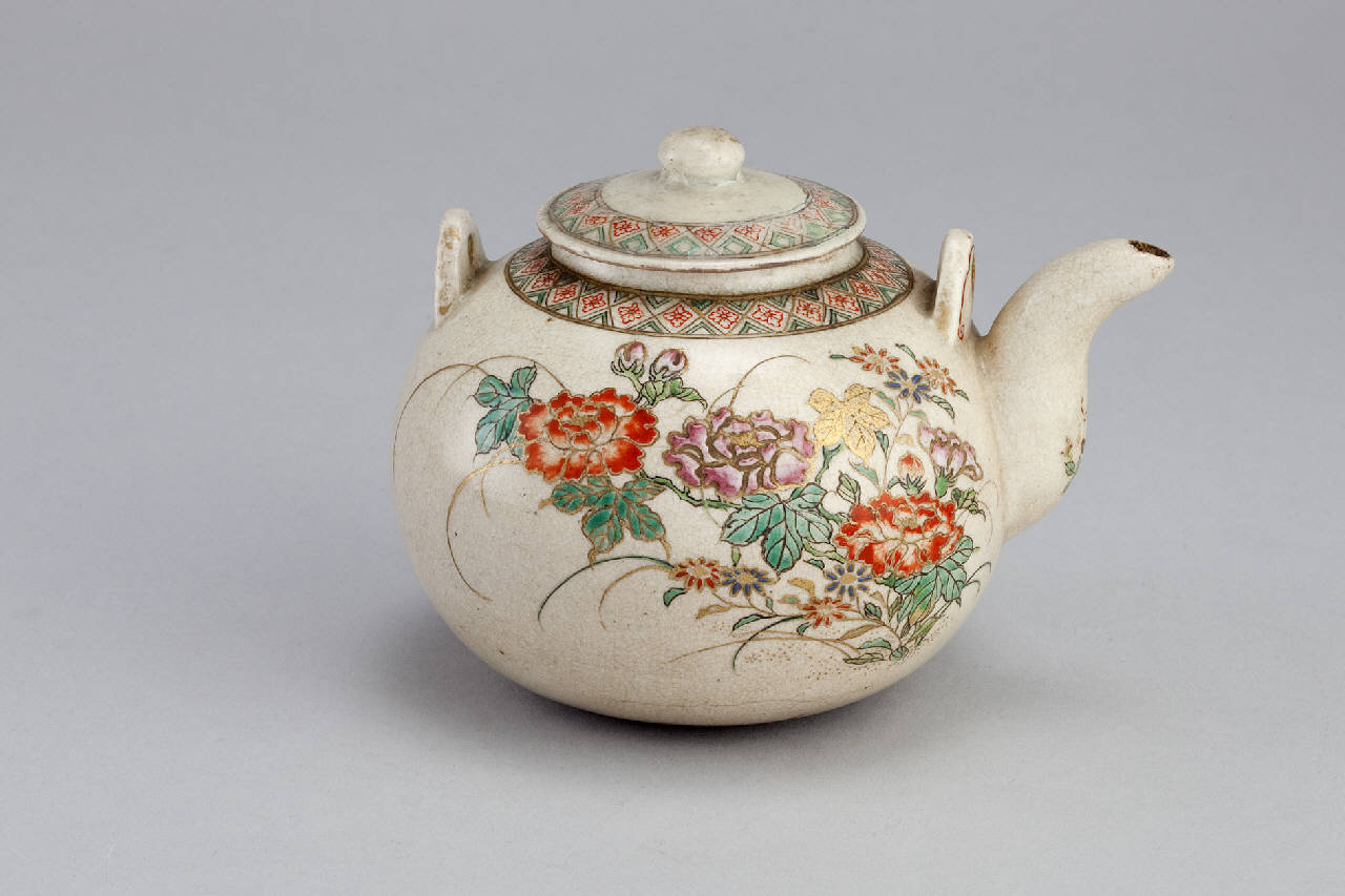 Teiera (kyusu) in ceramica invetriata, smaltata in policromia e parzialmente dorata. A sezione pressoché circolare ha beccuccio ricurvo e presa ad anello; il coperchio, anch'esso circolare, è dotato di pomolo. La decorazione sull'esterno mostra composizioni floreali e bande con motivi geometrici.