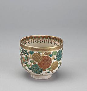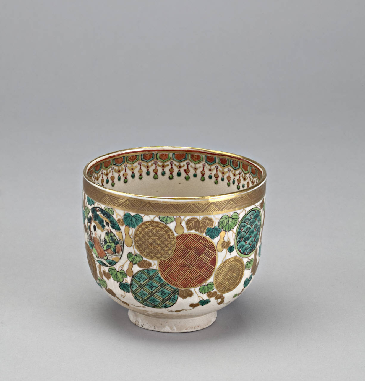 Tazza (wan) in porcellana invetriata, smaltata in policromia e parzialmente dorata. A sezione circolare, posa su base ad anello. La decorazione mostra sull'esterno un tappetto di rami di zucca con foglie e frutti, sul quale si sovrappongono medaglioni circolari di varia grandezza ornati con motivi geometrici, o floreali, o con figure. All'interno, verso il bordo, banda di tipo geometrico.