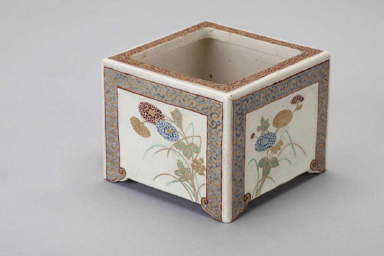 Vasetto in ceramica invetriata, smaltata in policromia e parzialmente dorata. A sezione quadrata, la decorazione sull'esterno si compone di mazzetti di fiori e bande a motivi floreali.