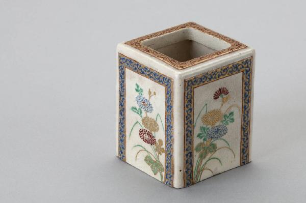 Vasetto in ceramica invetriata, smaltata in policromia e parzialmente dorata. A sezione quadrata, la decorazione sull'esterno si compone di mazzetti di fiori e bande a motivi floreali.