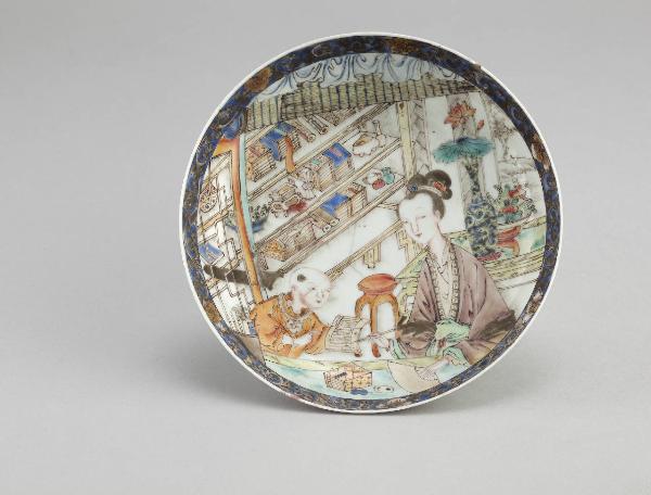Piattino in porcellana invetriata, dipinta a smalti policromi e arricchita da diffusi tocchi d'oro. Posa su base ad anello. La decorazione sulla superficie a vista mostra una scena con una dama e un bambino, evidentemente cinesi, all'interno di una casa con molte suppellettili (associato alla tazzina G 73).