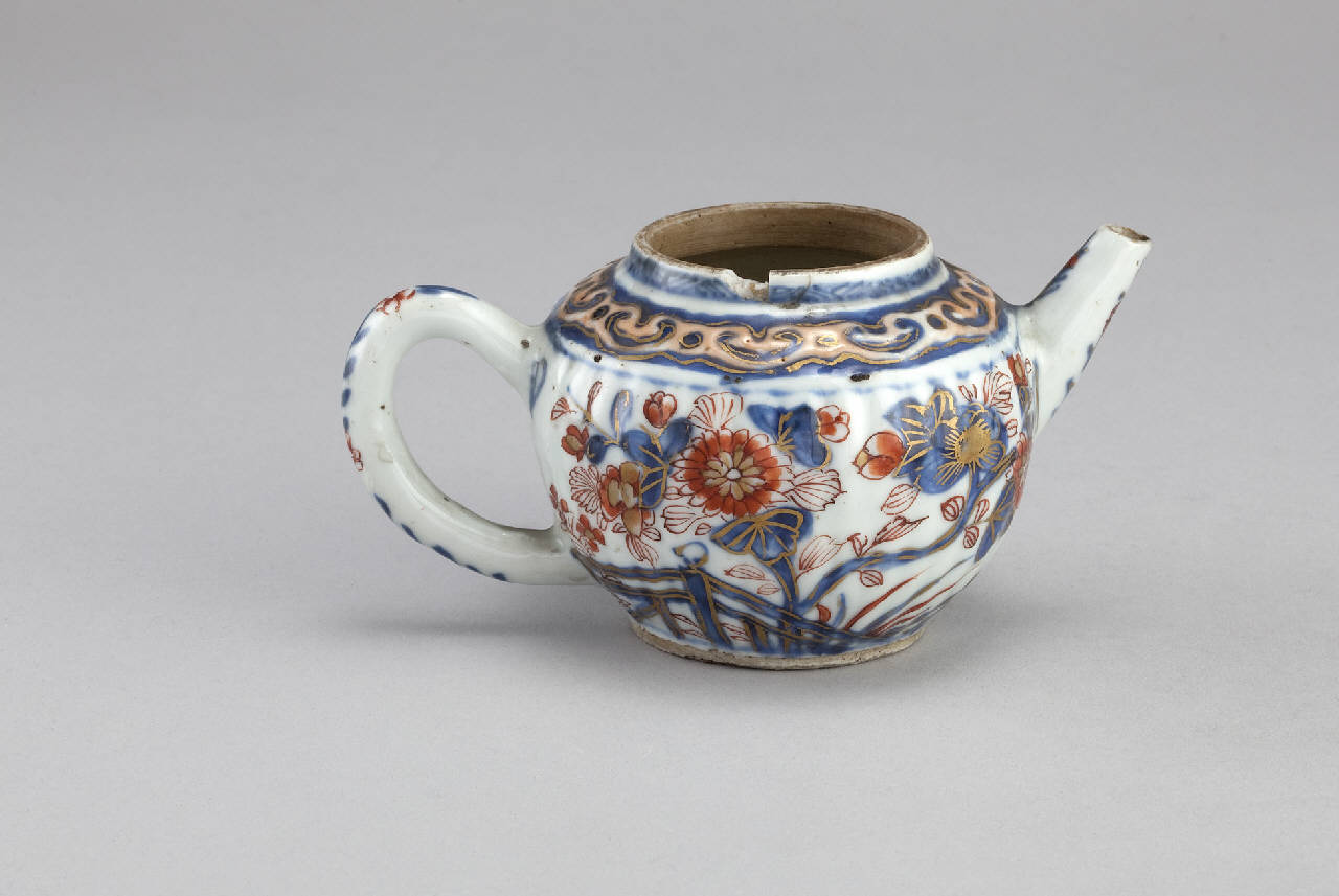 Piccola teiera (kyusu) in porcellana dipinta a smalto blu di cobalto sotto invetriatura trasparente, con smalto rosso e lumeggiature d'oro al di sopra della vetrina. Ha forma globulare, con beccuccio diritto e manico ad anello. La decorazione consiste in motivi floreali.