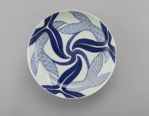 Piatto (sara) circolare in porcellana dipinta a smalto blu di cobalto sotto invetriatura trasparente. La decorazione mostra sulla superficie a vista una composizione geometrica, consistente nell'intersezione di foglie e code di pesce stilizzate.