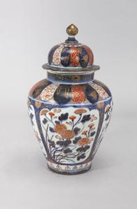 Vaso in porcellana dipinta in smalto blu sotto coperta, rosso e oro sopra l'invetriatura trasparente. Sezione circolare, con spalla bombata e collo troncoconico. Coperchio emisferico con presa a cipolla. Decorazione floreale, in parte disposta entro cartigli, in parte libera.