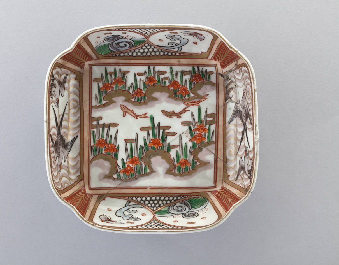 Ciotola in porcellana dipinta a smalti policromi e arricchita da tocchi d'oro. Ha le quattro pareti modellate a ogive. La decorazione consiste di motivi floreali, onde e uccelli disposti entro cartigli.