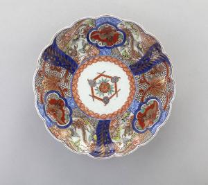 Piatto in porcellana dipinta a smalti policromi e arricchita da tocchi d'oro. Ha parete e orlo sagomati in sgonfi regolari, così che il piatto ricorda per forma una corolla stilizzata di crisantemo (kiku). La decorazione consiste in un medaglione centrale intorno al quale si dispone una pannellatura radiale con motivi floreali e geometrici, draghi (ryu) e gru (tsuru).