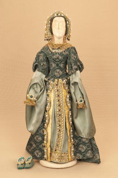 Costume da nobildonna di foggia cinquecentesca composto da gonna, corpino, scarpe e cappello.