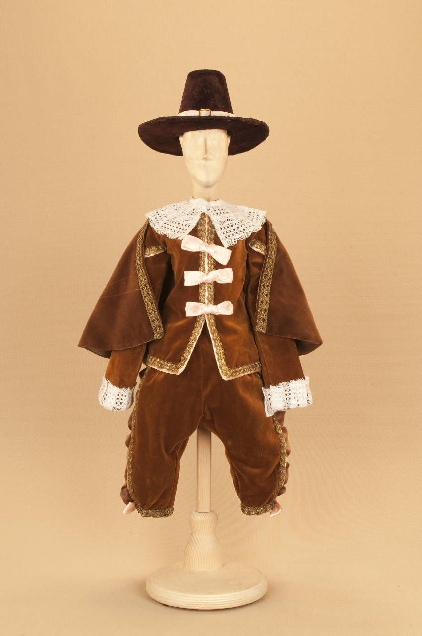 Costume da nobiluomo di foggia seicentesca composto da calzoni, casacca, collo, cappa e cappello.
