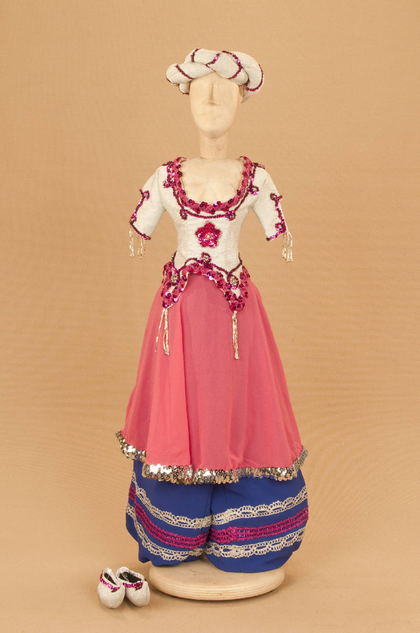 Costume da donna orientale composto da pantaloni, gonna, corpino, turbante e scarpe.