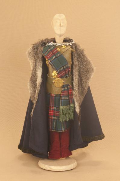 Costume da uomo scozzese composto da calzabraghe, kilt, sciarpa, armatura in pelle e mantello.
