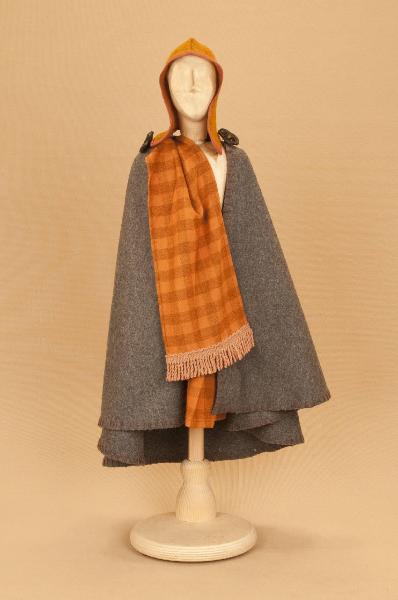 Costume da uomo scozzese composto da kilt, sciarpa, cuffia e mantello.