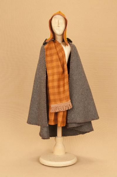 Costume da uomo scozzese composto da kilt, sciarpa, cuffia e mantello.