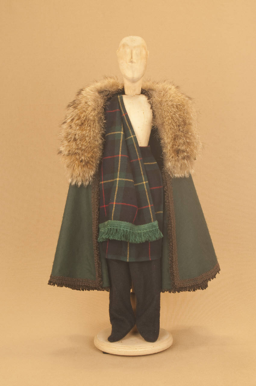 Costume da uomo scozzese composto da calzamaglia, kilt, sciarpa e mantello.