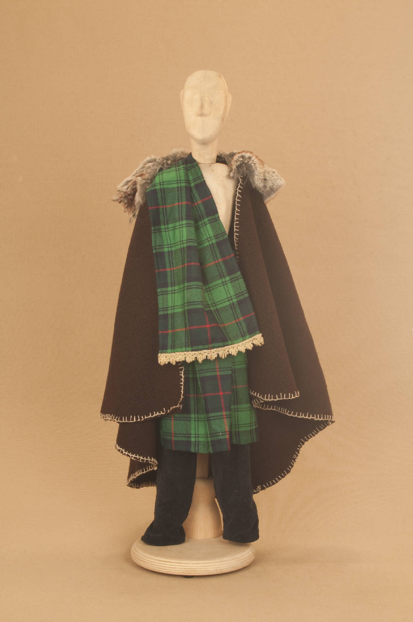 Costume da uomo scozzese composto da calzabraghe, kilt, sciarpa e mantello.