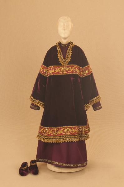 Costume da nobiluomo medievale composto da veste, sopravveste e scarpe.