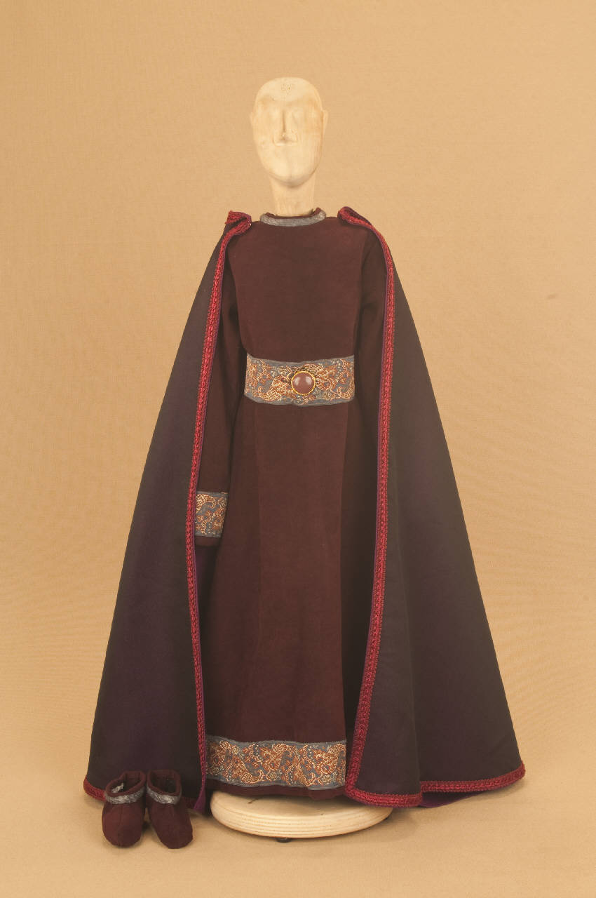 Costume da nobiluomo medievale composto da veste, mantello, cintura e scarpe.