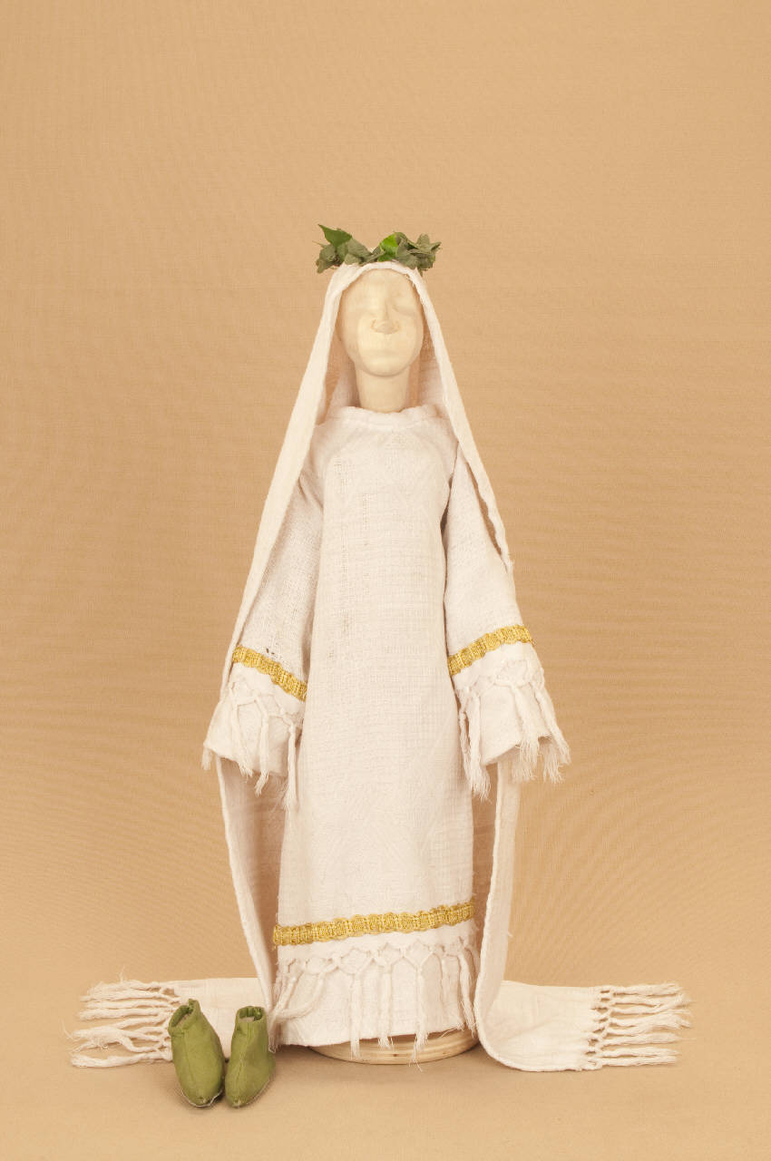 Costume da sacerdote medievale composto da tunica, amitto, scarpe e corona.