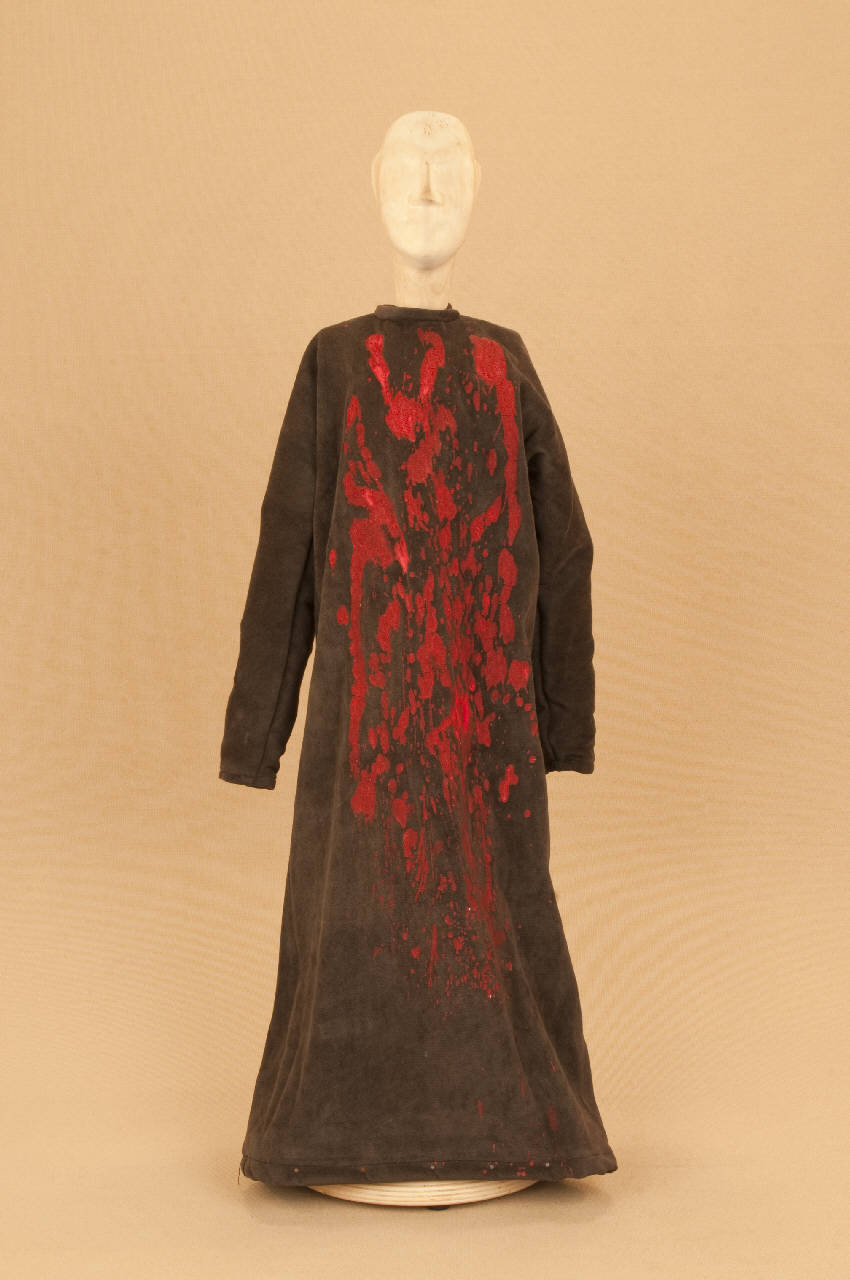 - NOTIZIE STORICO CRITICHE Il costume è stato realizzato per lo spettacolo "Macbeth". Come altre opere di Shakespeare quali "Re Lear", "Otello", "Romeo e Giulietta", il "Macbeth" fu sempre presente nel repertorio delle Compagnie di marionette e burattini che, così, compivano la loro operazione di divulgazione in ambito popolare spostandosi di paesi in città.\nLa Carlo Colla e Figli, abbandonato il vecchio spettacolo entrato in repertorio come si rileva da un elenco delle produzioni di Carlo Colla nel Libro Mastro datato 1863-1879, ha messo in scena nel 2007 questo nuovo allestimento per lo Shakespeare Theater di Chicago, con la supervisione di Kate Bucley che ha curato la parte attorale in lingua ed i tagli al testo. Lo spettacolo, dopo la programmazione a Chicago, ha proseguito le repliche al New Victory Theater di Broadway e nel 2010 è apparso per la prima volta in Europa al Piccolo Teatro Grassi di Milano.