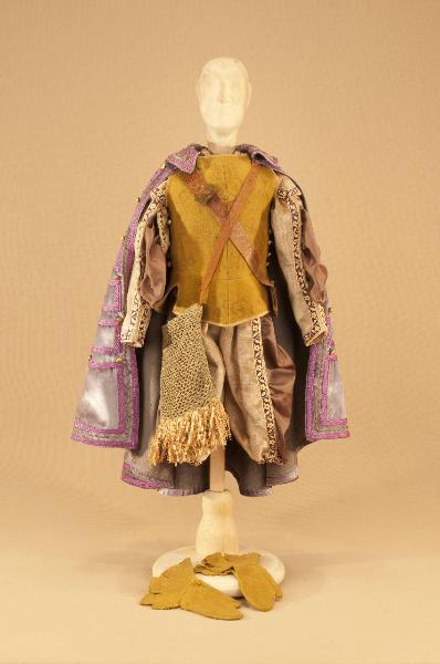 Costume da nobiluomo della caccia composto da calzoni, giacca, giustacuore, budriere, carniere, guanti e mantello.