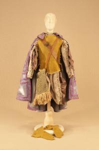 - NOTIZIE STORICO CRITICHE Il costume, che si completa con grande collettone in pizzo, cappello alla moschettiera a tesa larga a cui applicare una lunga piuma colorata, alti polsi, cintura, stivali e speroni, è stato rifatto in parte da Eugenio Monti Colla nel 1973, in occasione delle riprese televisive Rai, per sostituire pezzi dell'abito ormai usurati. "Il gatto con gli stivali" è una fiaba con struttura di operetta messa in scena nel 1911 da Carlo II Colla per la Compagnia Carlo Colla e Figli. Il manoscritto proviene dalla Compagnia Lupi che agiva al Teatro Gianduia di Torino: lo attesta una dicitura riportata sul retro della copertina. L¿edizione marionettistica della Compagnia Carlo Colla presenta nella forma della féerie (parti recitate alternate alle parti cantate e alle parti musicate) la celebre fiaba di Charles Perrault. La messa in scena risente del gusto dell'epoca verista dell'operetta e ricalca con notevole perizia i temi della nostra tradizione popolare. La musica del maestro Felice Camesasca sottolinea lo spettacolo in modo sovente ironico e sorprendente; le scene sono dello scenografo Achille Lualdi (1869-anni ¿50).\nIntervengono inoltre nello spettacolo, intuizioni culturali come il richiamo al mondo degli animali di La Fontane nel gioco teatrale del capovolgimento fra animale ed essere umano.\n"Il gatto con gli stivali" è una delle prime fiabe ad entrare nel repertorio della Compagnia Carlo Colla e Figli.\nNegli anni ¿20 alcuni costumi vengono sostituiti con abiti realizzati da Caramba. Nel 1946 viene realizzato dalla casa di produzione "Saturnia" un cortometraggio, per la regia di Mario Baffico (1907-1972). Nel 1973, in occasione delle riprese televisive prodotte dalla RAI per la trasmissione "Marionette e Burattini" con la regia di Eugenio Giacobino al Teatro Litta, Eugenio Monti Colla provvede al restauro di numerosi costumi. Nel 1987, per il riallestimento dello spettacolo al Teatro Litta, nell'ambito della collaborazione con il "CRT Artificio" (1986-1994), vengono realizzati nuovi costumi, nuove marionette e nuovi materiali di attrezzeria.
