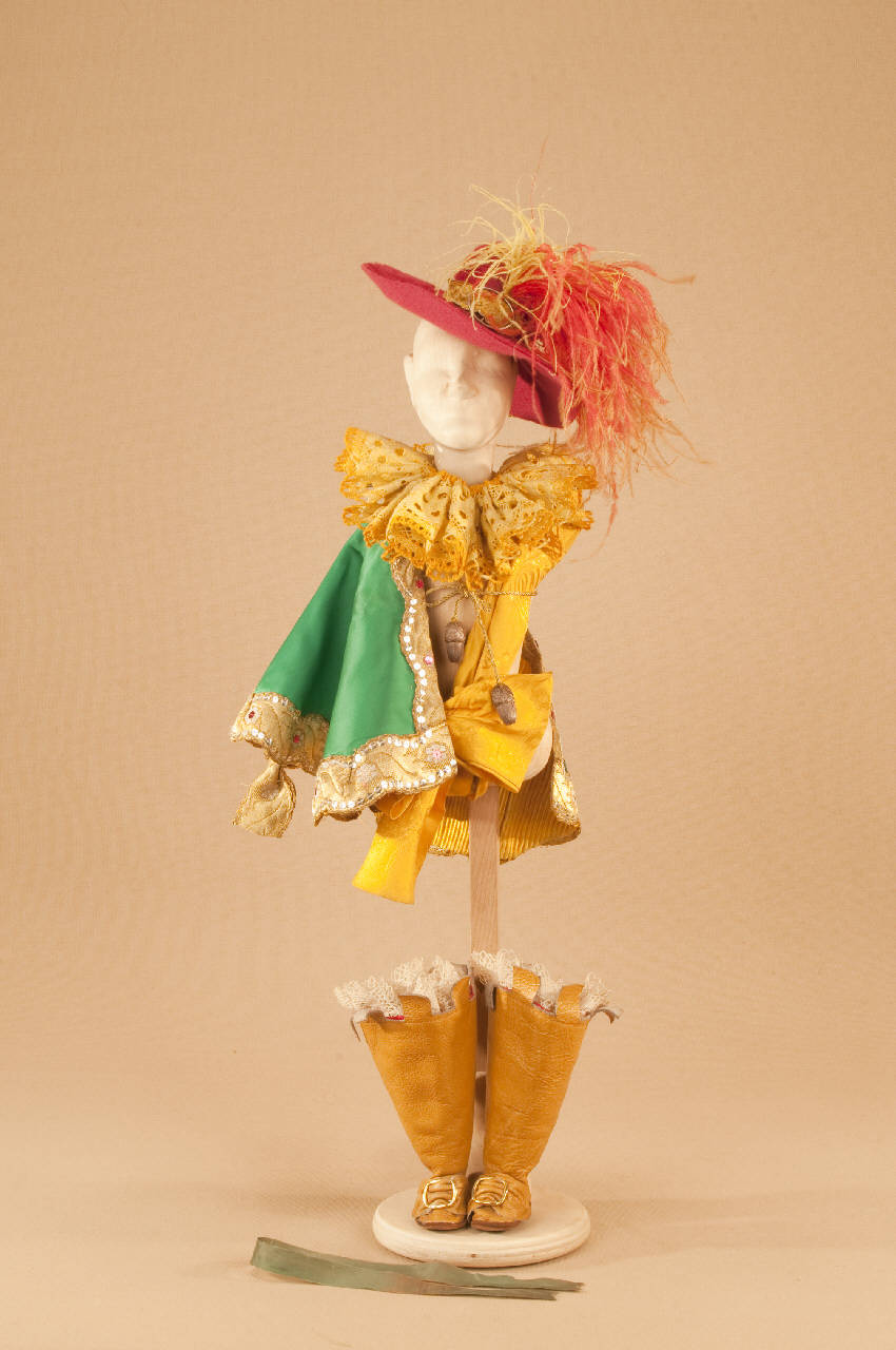 - NOTIZIE STORICO CRITICHE Il costume è indossato da una marionetta con corpo e testa da gatto, in posizione eretta. "Il gatto con gli stivali" è una fiaba con struttura di operetta messa in scena nel 1911 da Carlo II Colla per la Compagnia Carlo Colla e Figli. Il manoscritto proviene dalla Compagnia Lupi che agiva al Teatro Gianduia di Torino: lo attesta una dicitura riportata sul retro della copertina. L¿edizione marionettistica della Compagnia Carlo Colla presenta nella forma della féerie (parti recitate alternate alle parti cantate e alle parti musicate) la celebre fiaba di Charles Perrault. La messa in scena risente del gusto dell'epoca verista dell'operetta e ricalca con notevole perizia i temi della nostra tradizione popolare. La musica del maestro Felice Camesasca sottolinea lo spettacolo in modo sovente ironico e sorprendente; le scene sono dello scenografo Achille Lualdi (1869-anni ¿50).\nIntervengono inoltre nello spettacolo, intuizioni culturali come il richiamo al mondo degli animali di La Fontane nel gioco teatrale del capovolgimento fra animale ed essere umano.\n"Il gatto con gli stivali" è una delle prime fiabe ad entrare nel repertorio della Compagnia Carlo Colla e Figli.\nNegli anni ¿20 alcuni costumi vengono sostituiti con abiti realizzati da Caramba. Nel 1946 viene realizzato dalla casa di produzione "Saturnia" un cortometraggio, per la regia di Mario Baffico (1907-1972). Nel 1973, in occasione delle riprese televisive prodotte dalla RAI per la trasmissione "Marionette e Burattini" con la regia di Eugenio Giacobino al Teatro Litta, Eugenio Monti Colla provvede al restauro di numerosi costumi. Nel 1987, per il riallestimento dello spettacolo al Teatro Litta, nell'ambito della collaborazione con il "CRT Artificio" (1986-1994), vengono realizzati nuovi costumi, nuove marionette e nuovi materiali di attrezzeria.