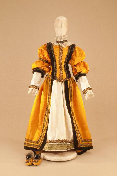 Costume da nobildonna di foggia tardo cinquecentesca composto da gonna, corpino e scarpe.
