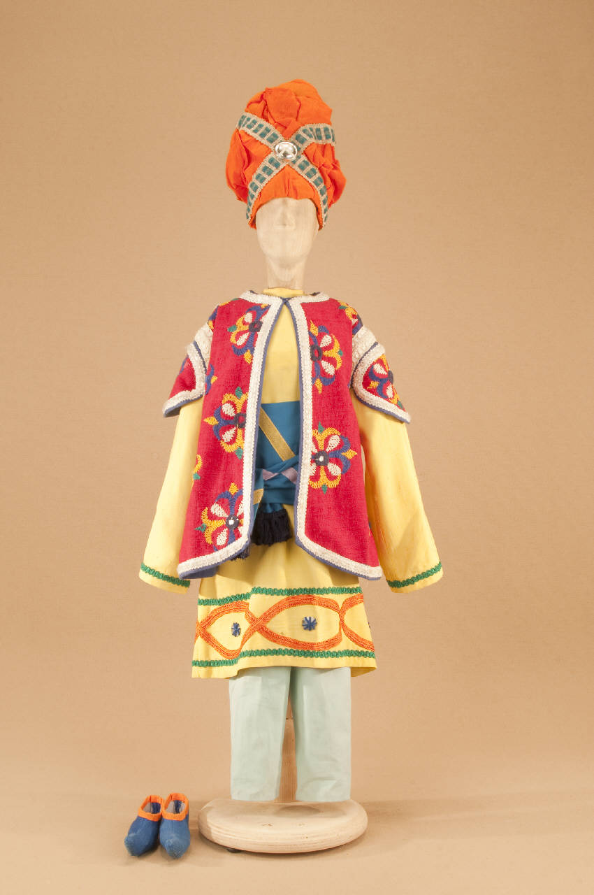 Costume folcloristico orientale composto da pantaloni, veste, sopravveste, fusciacca, scarpe e turbante.