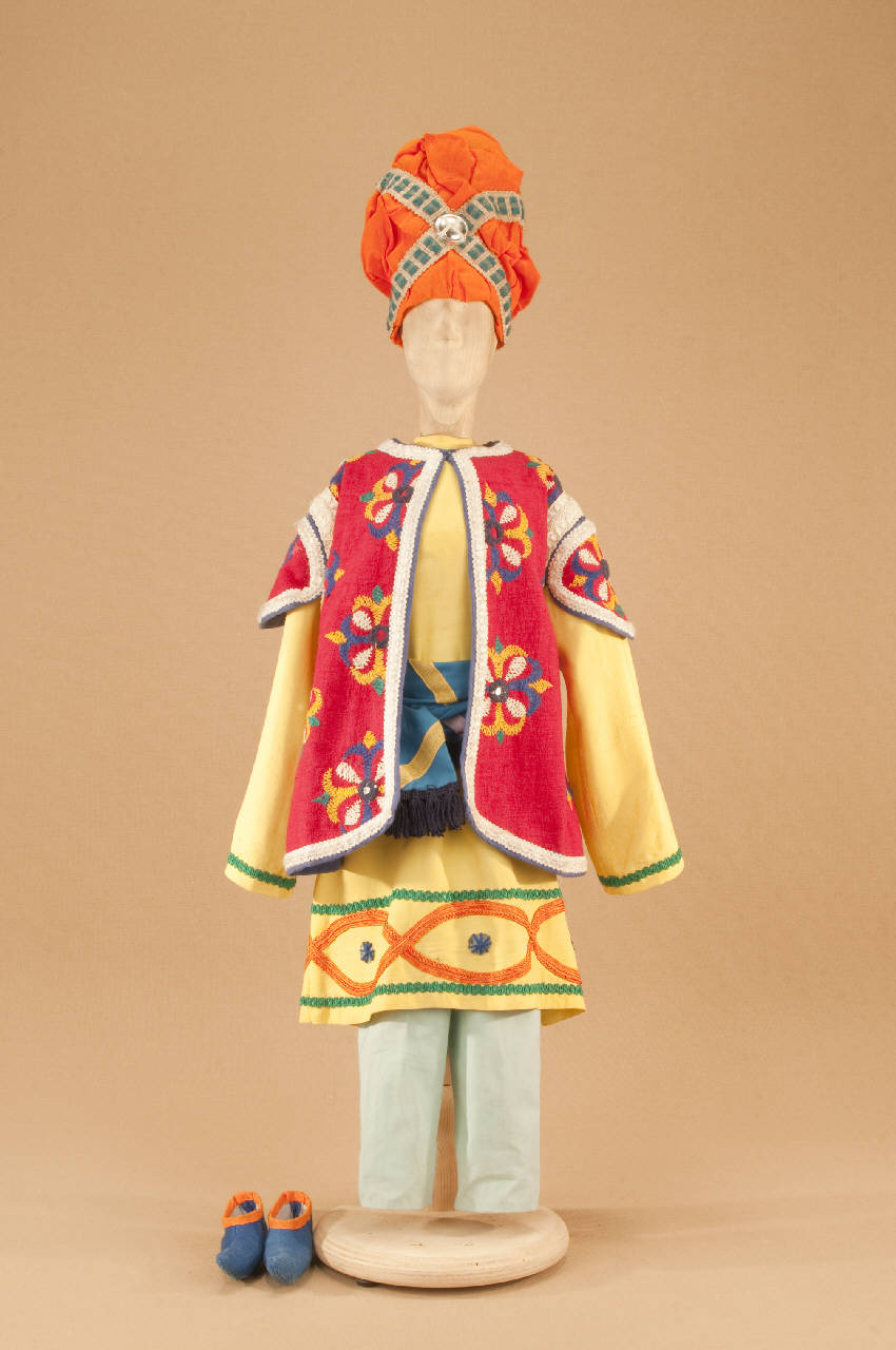 Costume folcloristico orientale composto da pantaloni, veste, sopravveste, fusciacca, scarpe e turbante.