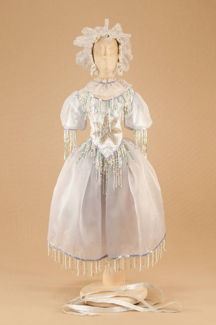 - NOTIZIE STORICO CRITICHE Il costume è stato realizzato in due momenti differenti: le basi della gonna e del corpino sono state confezionate nel 2002, su ideazione di Eugenio Monti Colla, da Mariapia Lanino; il completamento è avvenuto nel Luglio del 2010 ad opera di Mariagrazia Citterio. "Il bacio della fata", in versione marionettistica, venne scritto mentre la Compagnia Carlo Colla e Figli stava presentando con grande successo i suoi spettacoli presso il Théatre du Vidy di Losanna, proprio di fronte a quel lago che aveva, più di mezzo secolo prima, ispirato Igor Stravinsky.\nArticolato drammaturgicamente con parti mimate, danzate e recitate, lo spettacolo si allinea con altre opere in repertorio che segnano le diverse tappe della storia del balletto: "Il flauto magico" ossia "Le danseurs involontaires" di Belardinelli, il "Prometeo" e "Le vestali" di Salvatore Viganò, il "Gran ballo Excelsior" della coppia Manzotti-Marenco, "Shéhérazade" di "Rimsky-Korsakov, "Petruschka" dello stesso Stravinsky, opere che nei secoli si sono affiancate alle grandi azioni coreografiche che hanno rappresentato nel passato e rappresentano ancora oggi momenti salienti nella drammaturgia caratteristica della Carlo Colla e Figli.\nLa trama del balletto si è dilatata sino ad assumere una struttura drammaturgica più complessa senza, però, venir meno allo schema voluto dall¿autore secondo la lezione giunta d¿oltralpe con Pixérécourt, prima e con Viganò, poi. Pertanto sono nati nuovi personaggi e nuove situazioni di sfondo all¿azione di centro.\nLa struttura coreografica riporta sulla scena "pas de quatre", "a solo" e danze di carattere.\nL¿adattamento della parte musicale è stato affidato al Maestro Danilo Lorenzini. Le scenografie sono curate da Franco Citterio, come le nuove sculture relative ai personaggi, e realizzate dallo stesso insieme a Cecilia Di Marco e Debora Coviello.\nI costumi, a cura di Cecilia di Marco ed Eugenio Monti Colla, sono realizzati dalla sartoria della Compagnia.\nLo spettacolo debutta nell¿autunno 2010.