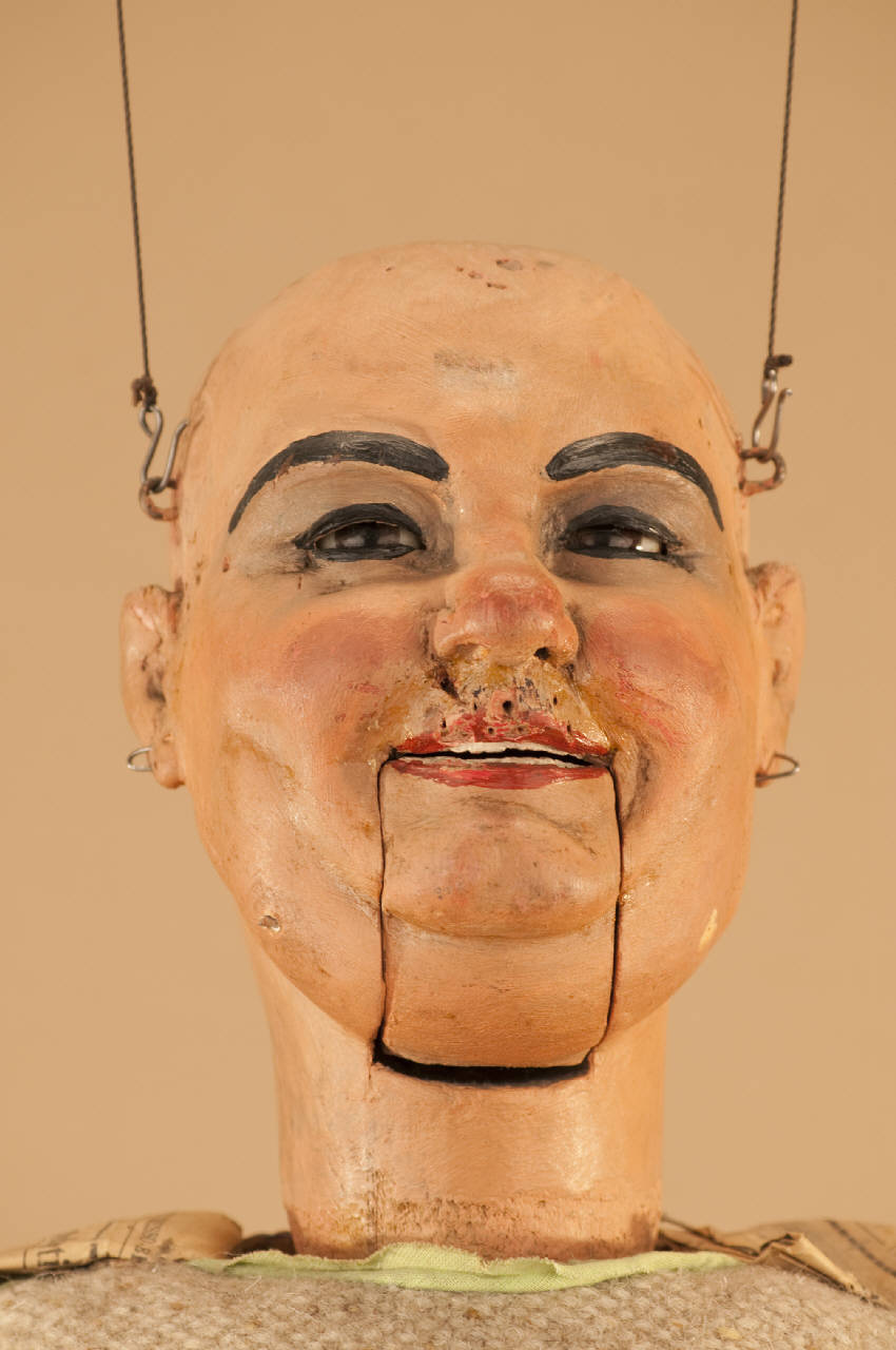 Testa in legno di tiglio con anello in ferro per bloccaggio al corpo. Occhi di vetro mobili. Bocca mobile. Tassello posteriore per intervenire sui meccanismi interni.