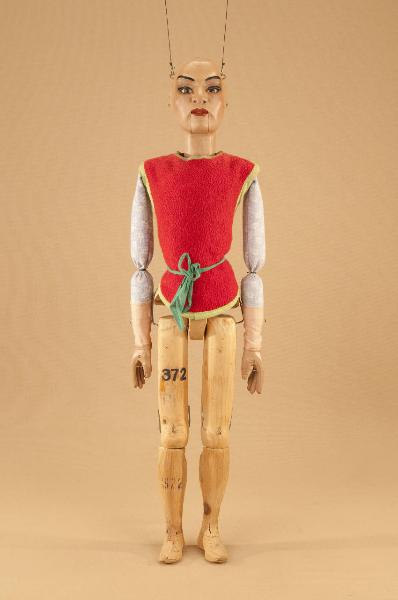 Testa di legno di tiglio fissata al corpo tramite ferro, occhi di vetro, bocca mobile. Corpo normale in abete snodato in vita e raccordato con doppia vite ad anello e tela. Gambe unite al bacino tramite bordione in ferro, ginocchia ad incastro mobile. Mani mobili in tiglio con dita scolpite e separate. Bilancino a croce metodo Holden.
