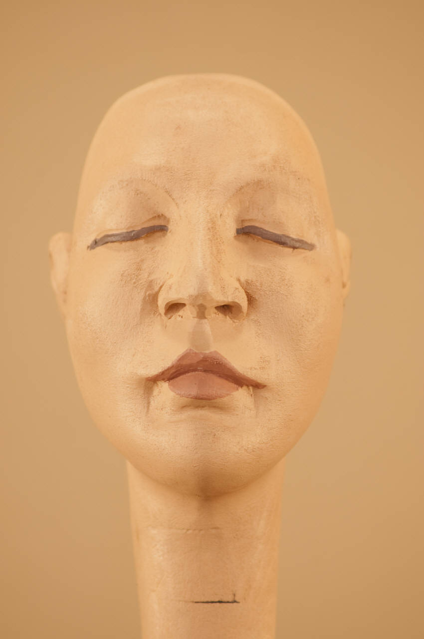 Testa in legno di tiglio senza occhi di vetro e con vite ad anello in acciaio alla base del collo.