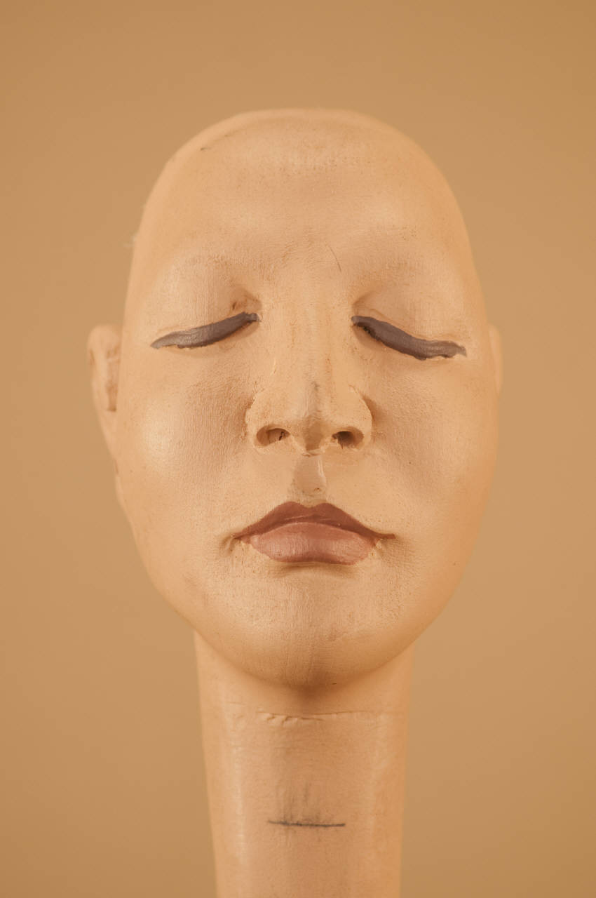 Testa in legno di tiglio senza occhi di vetro e con vite ad anello in acciaio alla base del collo.