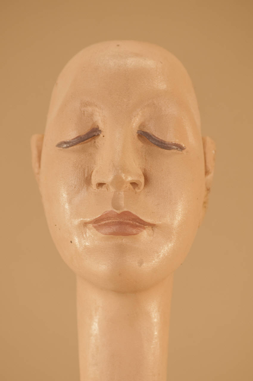 Testa in legno di tiglio senza occhi di vetro e con vite ad anello in acciaio alla base del collo.