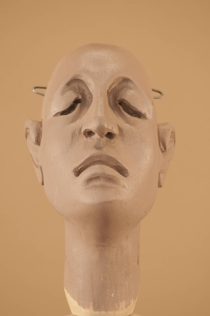 Testa in legno di tiglio senza occhi di vetro e con forchinelle in acciaio alle tempie e alla base del collo.