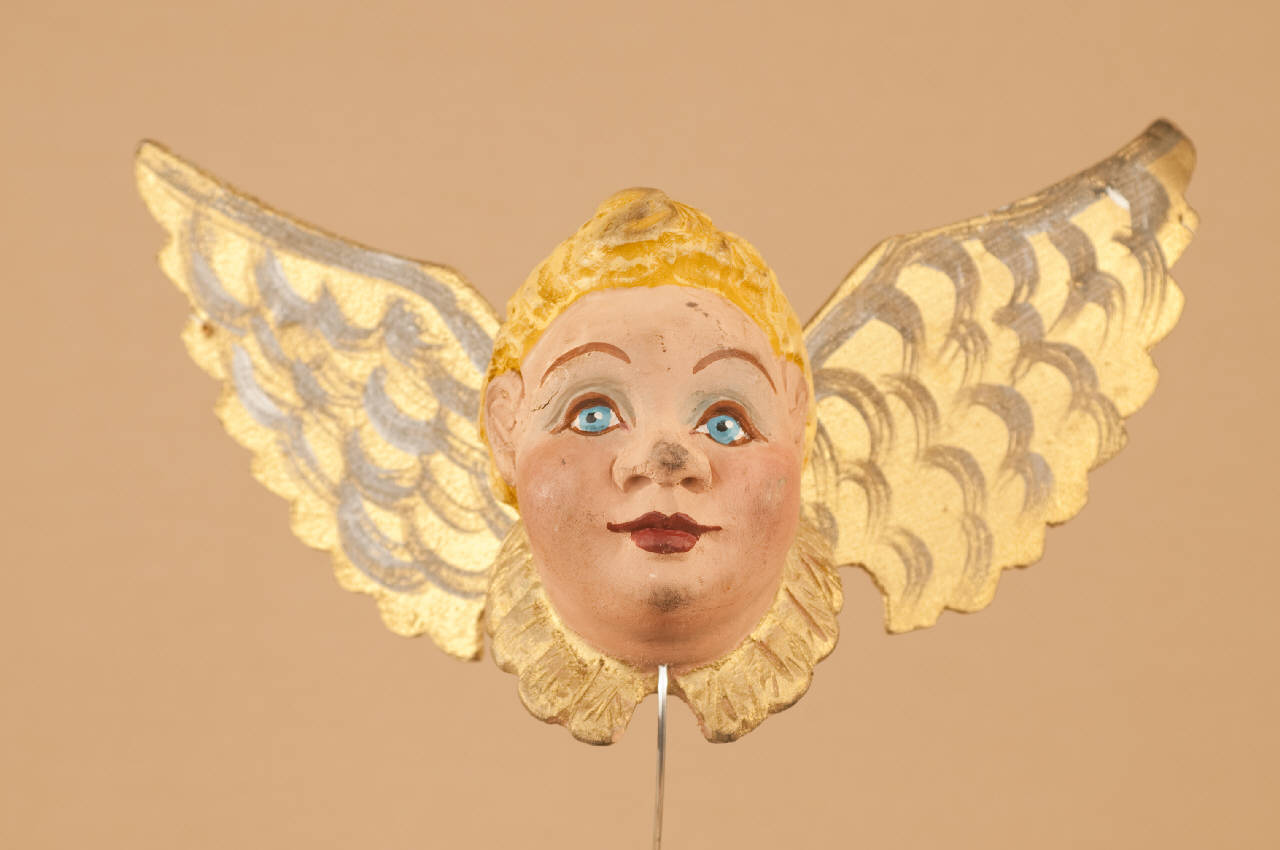 Testa in legno di tiglio. Ali in cartone unite con una molla piatta e inchiodate alla nuca.