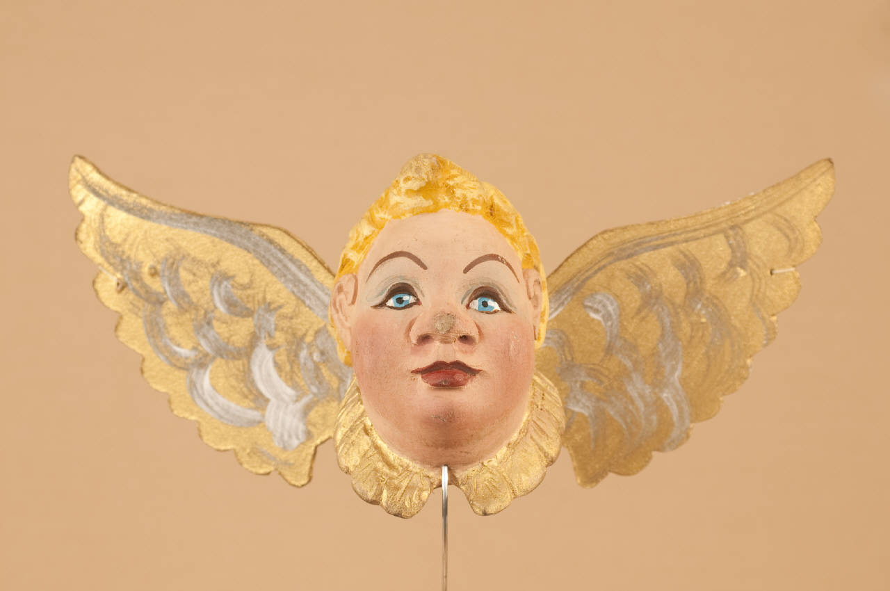 Testa in legno di tiglio. Ali in cartone unite con una molla piatta e inchiodate alla nuca.