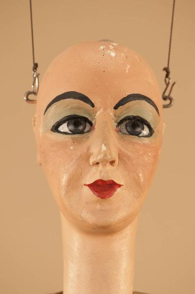 Testa di legno di tiglio fissata al corpo tramite ferro, occhi di vetro. Corpo normale in abete. Gambe unite al bacino tramite bordione in ferro in modo che si aprano lateralmente, ginocchia mobili con linguetta in acciaio. Braccia e mani in tiglio con dita scolpite e separate. Piedi mobili. Bilancino metodo Holden per ballerini.