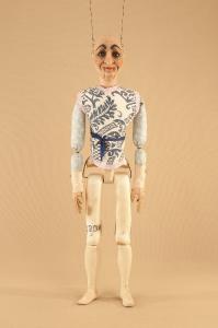 Testa in legno di tiglio fissata al corpo tramite ferro, occhi di vetro. Bocca mobile. Corpo in abete tagliato al bacino. Mani mobili con dita scolpite e separate. Piedi e braccia piombati. Bilancino a croce metodo Holden.