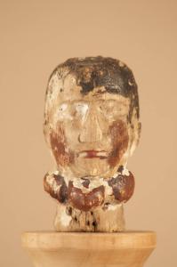 Testa in legno di pino dipinto e con foro nel collo.