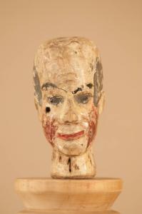 - NOTIZIE STORICO CRITICHE Si tratta probabilmente di una testa di burattino giocattolo vista la ridotta dimensione del foro nel collo. In collezione sono presenti altre teste di burattino aventi le stesse caratteristiche strutturali e stilistiche. Il collo presenta inoltre tracce di chiodi a testimoniare una vecchia attaccatura per il buratto.