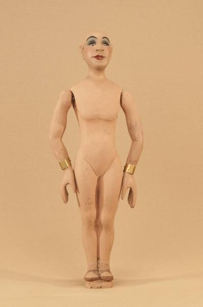 Marionetta in legno di tiglio che ha mobili solo le braccia. Bracciali in ottone ai polsi.