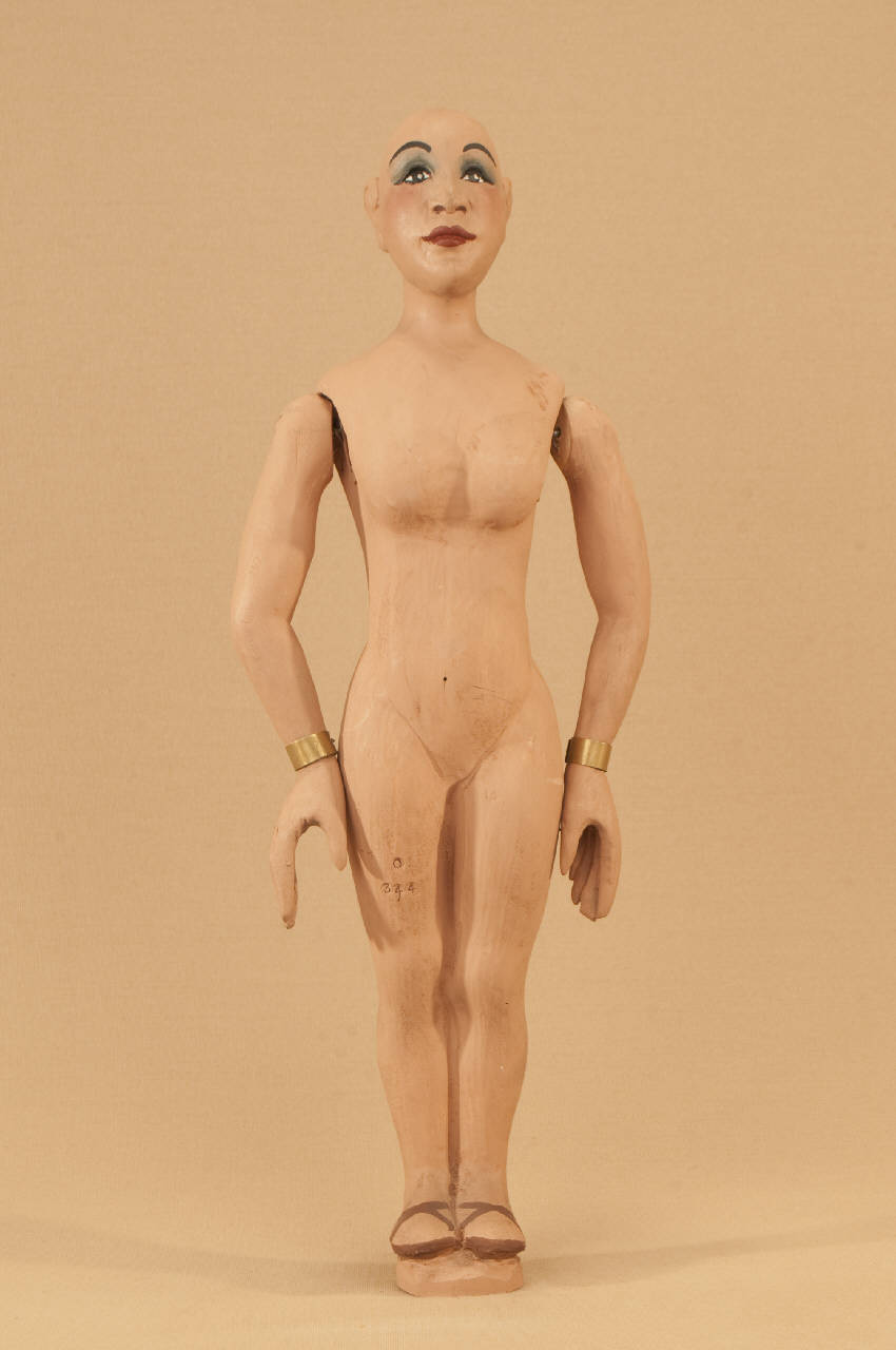 Marionetta in legno di tiglio che ha mobili solo le braccia. Bracciali in ottone ai polsi.