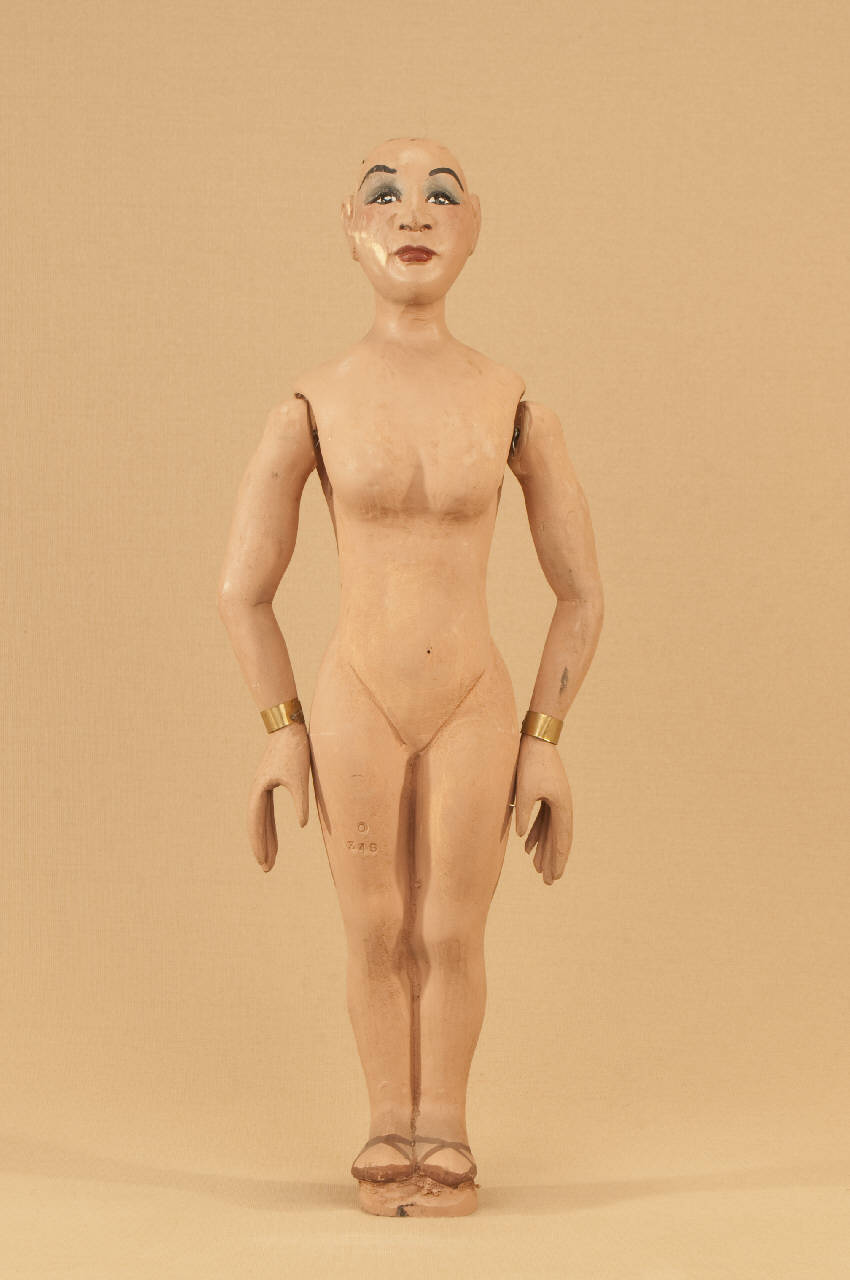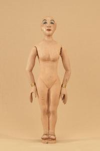 Marionetta in legno di tiglio che ha mobili solo le braccia. Bracciali in ottone ai polsi.