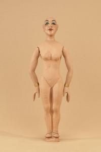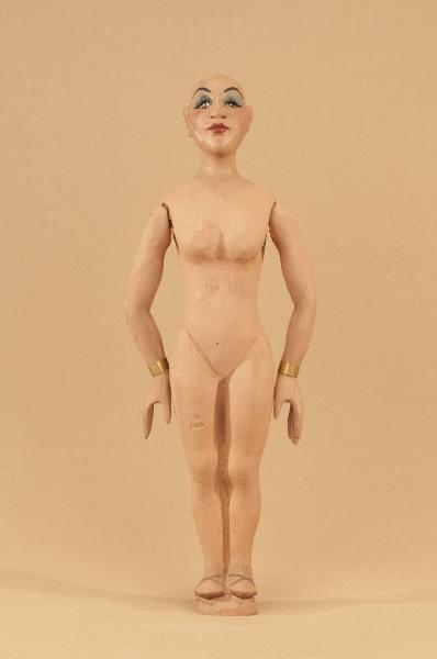 Marionetta in legno di tiglio che ha mobili solo le braccia. Bracciali in ottone ai polsi.
